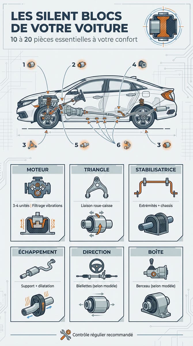Votre voiture embarque entre 10 et 20 silent blocs répartis sur différents points stratégiques. Les silent blocs moteur maintiennent le bloc propulseur sur le châssis tout en filtrant ses vibrations, en général au nombre de trois ou quatre selon les modèles. Les silent blocs de triangle de suspension se situent aux points d’ancrage des bras de suspension sur le berceau, assurant la liaison entre la roue et la caisse. La barre stabilisatrice dispose de ses propres silent blocs à chaque extrémité et au niveau de ses fixations sur le châssis. Le système d’échappement repose sur des silent blocs spécifiques qui supportent le poids de la ligne tout en absorbant les dilatations thermiques. Certains véhicules disposent de silent blocs sur les biellettes de direction ou les berceaux de boîte de vitesses, multipliant les points de contrôle potentiels.