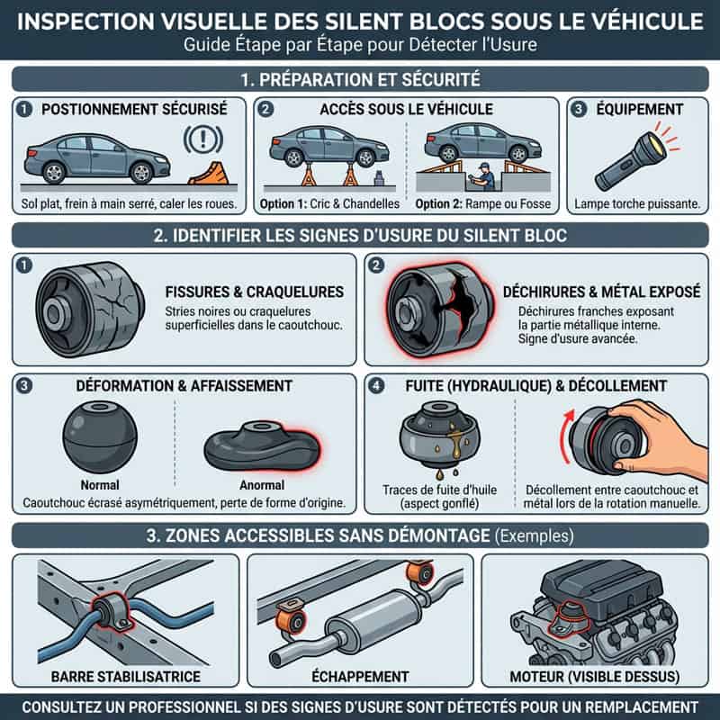Garez votre voiture sur un sol plat, serrez le frein à main et calez les roues. Si vous disposez d’un cric et de chandelles, levez l’avant ou l’arrière selon la zone à inspecter. Sinon, une simple rampe d’accès ou un passage sur fosse suffisent. Armez-vous d’une lampe torche puissante et commencez votre inspection méthodique. Examinez chaque silent bloc accessible en recherchant les fissures dans le caoutchouc, qui apparaissent comme des stries noires ou des craquelures à la surface. Les déchirures franches exposent parfois la partie métallique interne, signe d’usure avancée. Vérifiez aussi la présence de déformation ou d’affaissement, le caoutchouc ne doit pas être écrasé de manière asymétrique. Un silent bloc qui a perdu sa forme cylindrique ou sphérique d’origine est bon pour le remplacement. Recherchez également des traces de fuite d’huile sur les silent blocs hydrauliques, reconnaissables à leur aspect gonflé. Portez attention aux décollements entre le caoutchouc et le métal, visibles quand vous tentez de faire pivoter manuellement la pièce. Les zones accessibles sans démontage incluent en général les silent blocs de barre stabilisatrice, certains silent blocs d’échappement et parfois les silent blocs moteur visibles depuis le dessus.