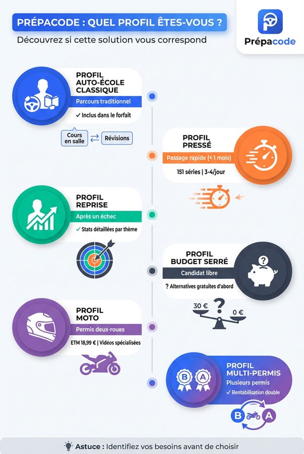 Certains profils tirent clairement plus de bénéfices que d’autres de cette solution. Le candidat inscrit en auto-école usuelle qui suit un parcours classique avec cours en salle et leçons de conduite trouve dans Prépacode un complément naturel, surtout que l’accès est en général inclus dans son forfait. Le suivi personnalisé par le moniteur via le portail Center crée une vraie cohérence pédagogique entre révisions à domicile et sessions en agence. Ce profil n’a d’ailleurs souvent pas le choix, l’établissement imposant sa solution.